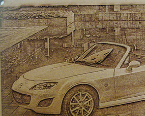 写真のデータを頂き、影になっている所は深く彫って、光の当たっている所はそのまま残してレーザー加工にて色の濃淡を表現していきます。